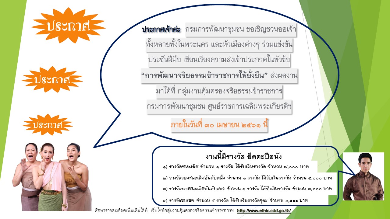 กรมการพัฒนาชุมชน เชิญชวนข้าราชการ พนักงานราชการ หรือลูกจ้างในสังกัดกรมการพัฒนาชุมชน ส่งเรียงความเข้าประกวดในหัวข้อ “การพัฒนาจริยธรรมข้าราชการให้ยั่งยืน” ส่งผลงานมาได้ที่กลุ่มงานคุ้มครองจริยธรรมข้าราชการฯ กรมการพัฒนาชุมชน ศูนย์ราชการเฉลิมพระเกียรติ ๘๐ พรรษา ๕ ธันวาคม ๒๕๕๐ อาคารบี ชั้น ๕ ถนนแจ้งวัฒนะ แขวงทุ่งสองห้อง เขตหลักสี่ กรุงเทพ ๑๐๒๑๐ ภายในวันที่ ๓๐ เมษายน ๒๕๖๑ นี้ รายละเอียดมีดังนี้