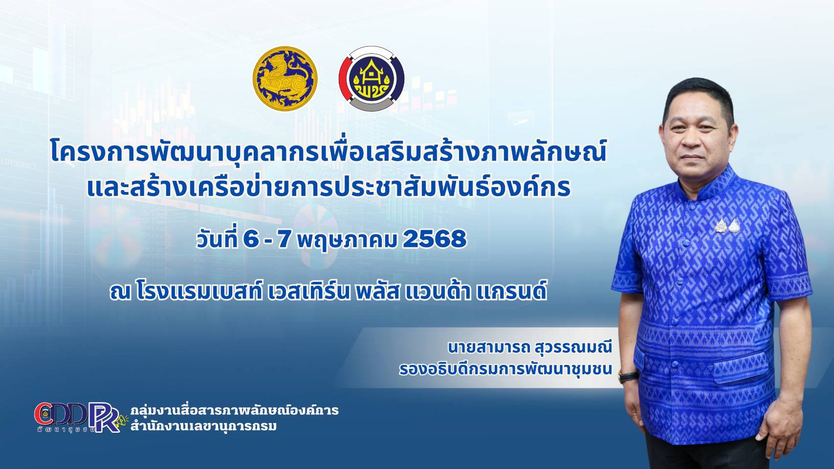 วันที่ 6 พฤษภาคม 2568 เวลา 09.00 น. นายสยาม ศิริมงคล อธิบดีกรมการพัฒนาชุมชน มอบหมายให้ นายสามารถ สุวรรณมณี รองอธิบดีกรมการพัฒนาชุมชน เป็นประธานพิธีเปิดโครงการพัฒนาบุคลากรเพื่อเสริมสร้างภาพลักษณ์