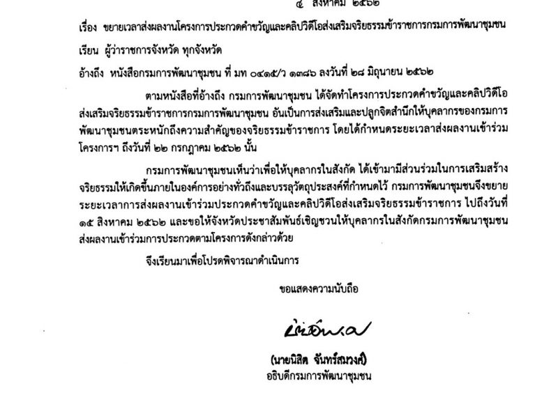 ขยายเวลาส่งผลงานโครงการประกวดคำขวัญและคลิปวิดีโอส่งเสริมจริยธรรมข้าราชการ